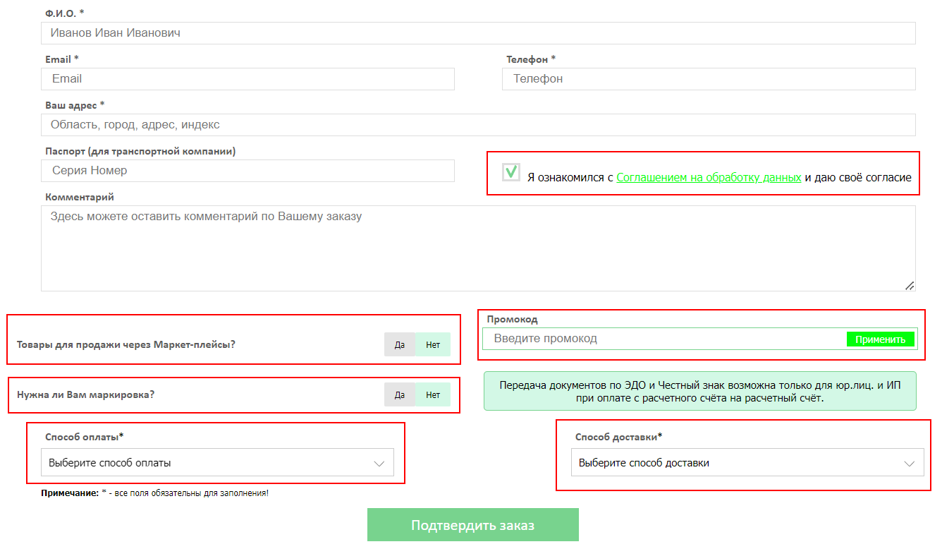 6. Выбрав нужный пункт, заполните анкету, где Вам нужно будет внести контактную информацию. Укажите, приобретается ли товар для продажи через маркет-плейсы и нужна ли Вам маркировка. Выберите удобные способ оплаты и доставки. Здесь же можно применить промокод на скидку (при наличии). После заполнения всех необходимых полей, обязательно поставьте галочку напротив согласия на обработку персональных данных.