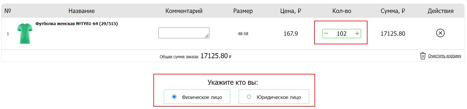 5. Проверьте правильность выбранных позиций, при необходимости удалите ненужные товары или измените колличество. Ниже, под вашим заказом, нужно будет выбрать, являетесь ли Вы физическим или юридическим лицом.