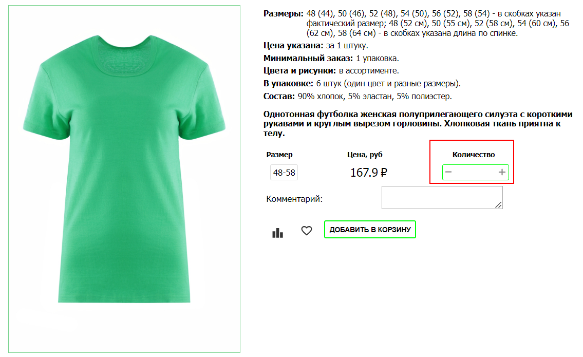 2. Выберете необходимое количество единиц товара рядом с размером.