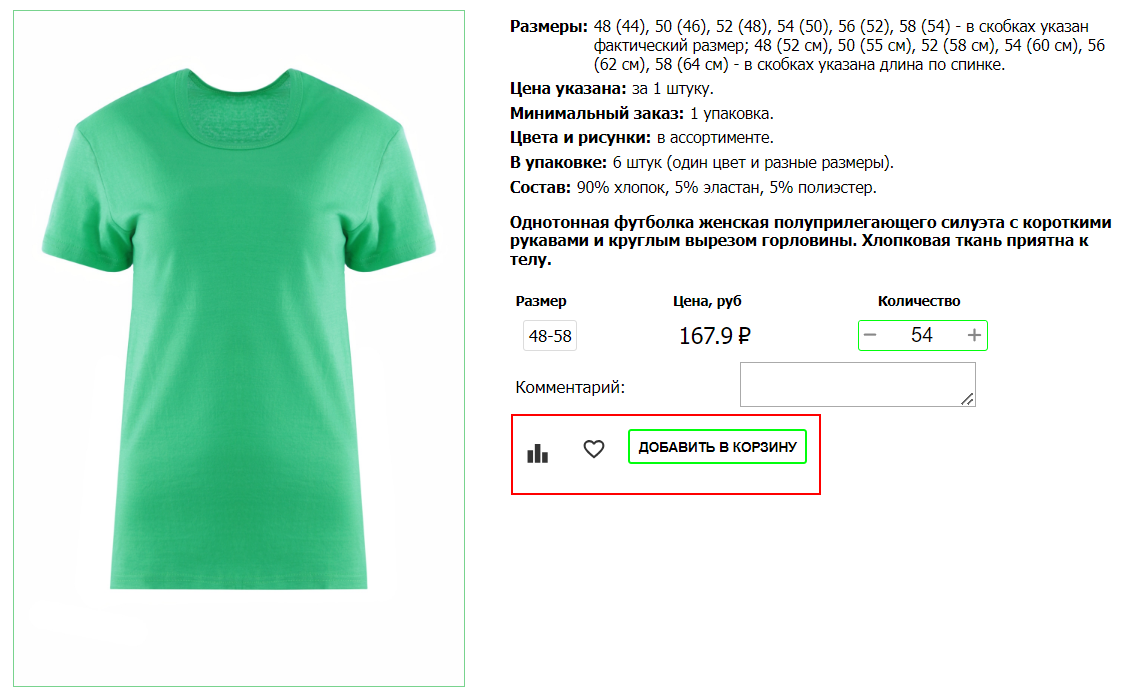 3. После того, как Вы указали количество, нажмите «Добавить в корзину» и переходите к следующему товару, позицию так же можно добавить в "Избранное" или в "Сравнение".