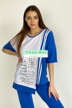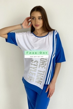 Футболка прямая, свободная, с округлой горловиной, с асимметричным низом. Рукав короткий. Центральная часть полочки выполнена из отделочного полотна. Вдоль шва соединения частей полочки расположены лампасы из отделочного полотна. Горловина обработана бейкой из основного полотна.